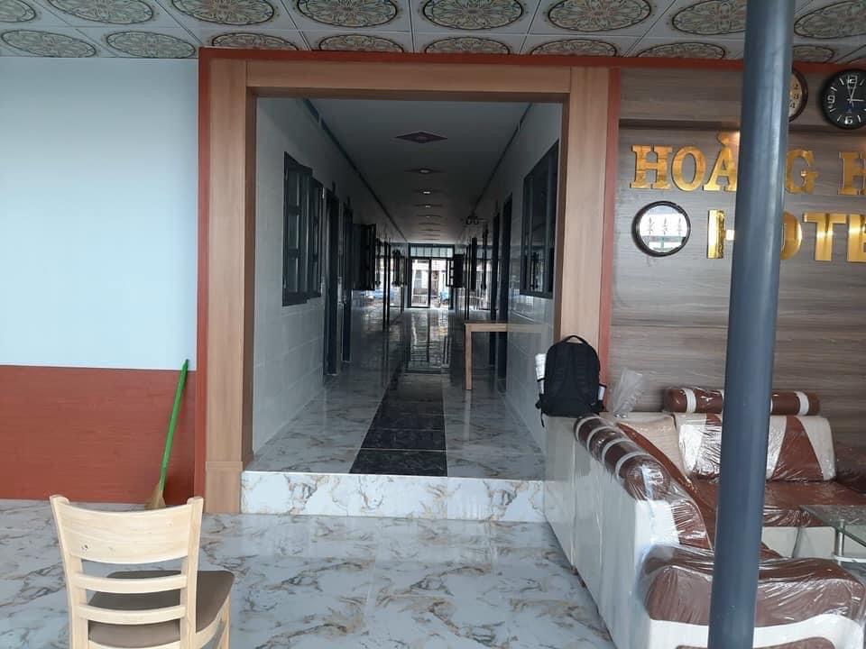 Khu vực sau quầy lễ tân được ốp vách giả gỗ tone nâu trầm, kết hợp logo chữ nổi “HOÀNG HÔN HOTEL” tạo hiệu ứng nhận diện rõ ràng,