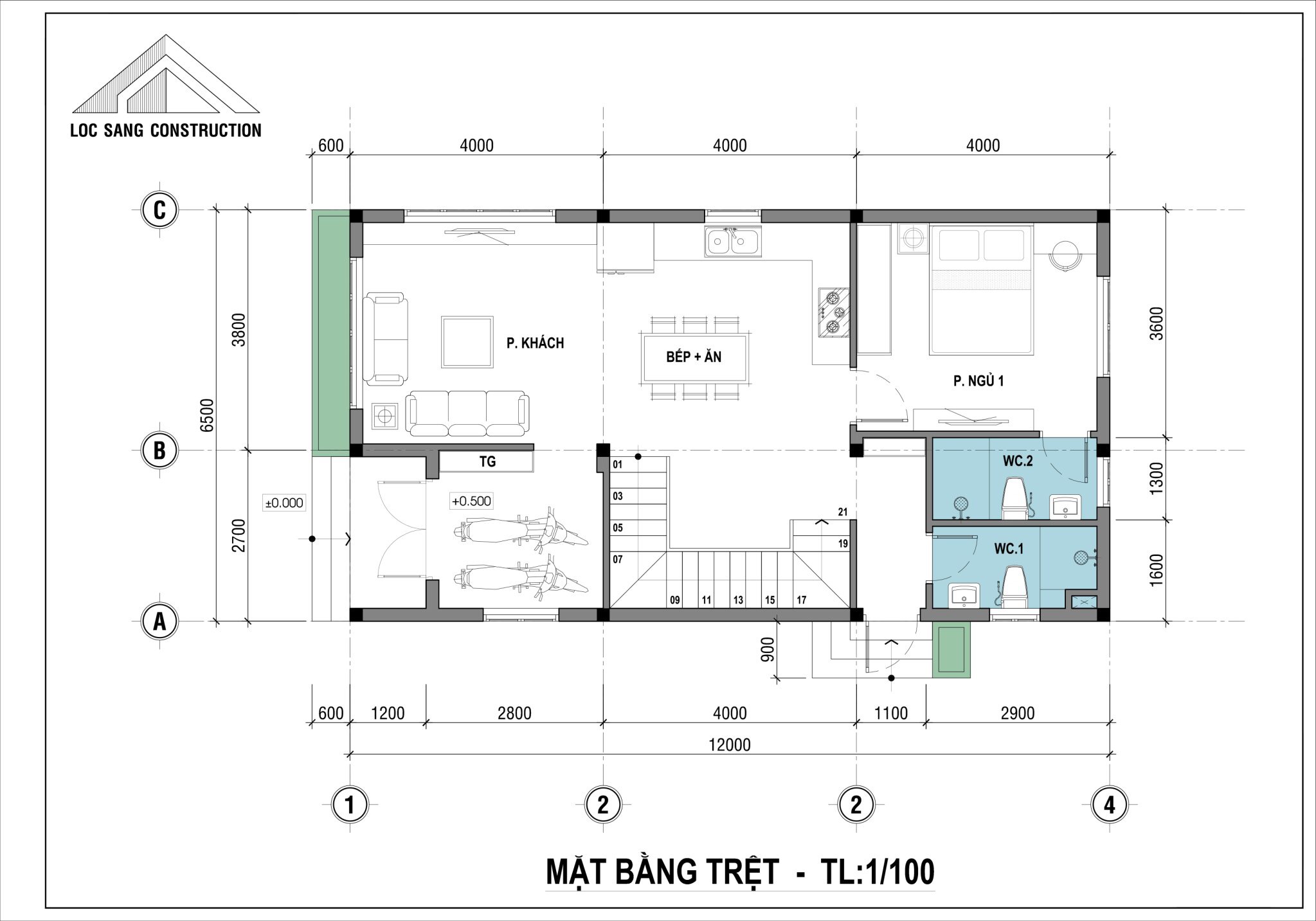 - Tầng trệt ưu tiên không gian sinh hoạt chung như phòng khách và bếp – ăn